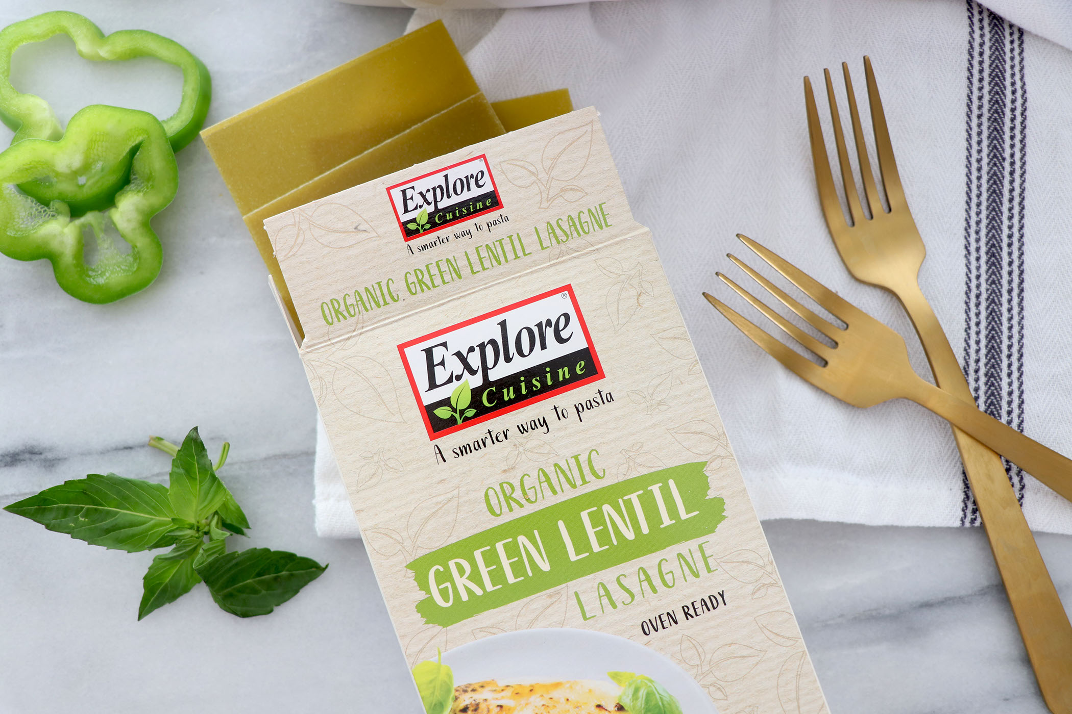 Glutenfreie Lasagneplatten aus Grünen Linsen, Erbsen und braunem Reis. Reich an Eiweiß und Geschmack, einfach ungekocht in die Lasagne schichten.